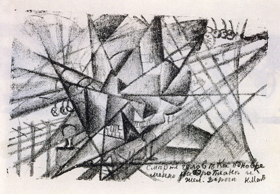 Казимир Малевич. Смерть человека одновременно на аэроплане и на железной дороге. 1913 Самоубийство Маяковского стало символическим крахом производственнической модели. В популярном мифе об этой трагедии присутствуют два главных оппонента производственничества. С одной стороны, сталинская милитаризация, которая, как предполагают, стала одной из причин кризиса в работе поэта. С другой — сюрреалистический срыв, смертельная драма любви. И милитаризм, и сюрреализм, в отличие от экономичного производственничества, отводят важное место разрушительным эксцессам, ужасным разрядкам внезапных эскалаций напряжения. Милитаризм придает им лицемерную форму неизбежного зла на дороге прогресса, в случае сюрреализма они выступают в голом, вызывающе бессмысленном, сексуально-революционном виде. Именно такие эксцессы пытались минимизировать производственники: революция для них была не стоп-краном, но точно рассчитанным тормозным механизмом. Борис Арватов осмысляет произошедшее с точки зрения производственнической экономики энергии: Маяковский не мог из поэта стать «лингвоинженером устной речи», точно регулирующим энергетические траты, и именно это привело его к трагическому коллапсу.