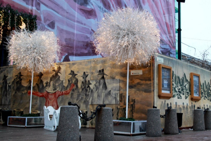 «Была использована сложная смешанная техника, включающей печать на строительной сетке, ассамбляж на фанере и роспись заграждения», — рассказала куратор проекта Альбина Мотор. В композицию интегрированы и настоящие афишные стенды театра.