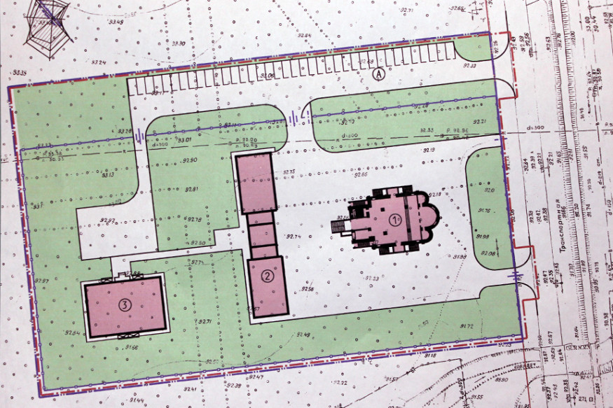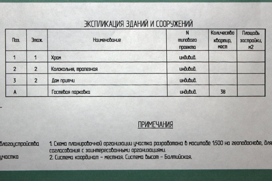 На плане есть схема размещения нескольких объектов, которые планируется построить: храм, колокольня с трапезной и дом причта. Гостевая парковка рассчитана на 38 машин.