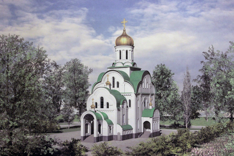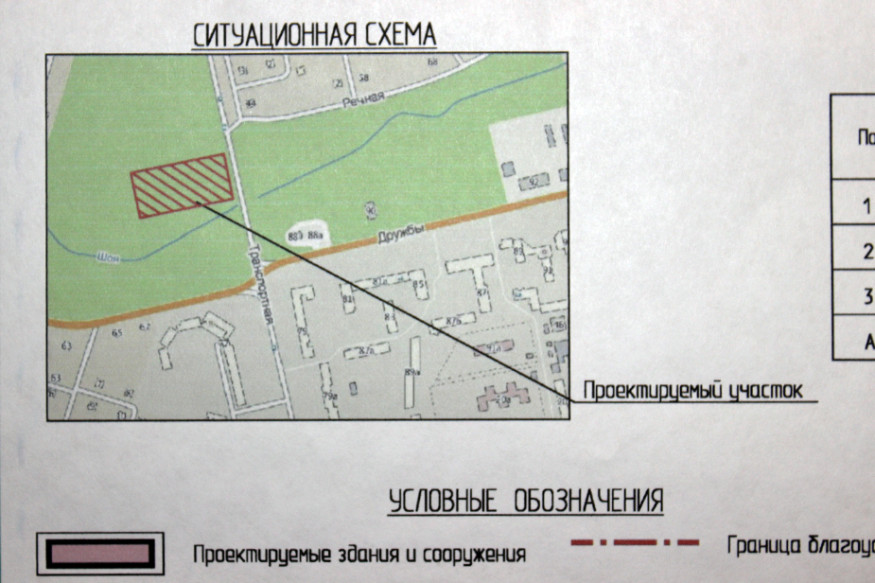 На одном из стендов — план строительства и эскиз будущей церкви. На ситуационной схеме изображено точное местонахождение: слева от ул. Транспортной, на территории, примыкающей (являющейся частью) к Тархановскому парку. По словам председателя оргкомитета слушаний, начальника управления архитектуры и градостроительства Анатолия Михайлова, место запланированной стройки не входит в территорию Тархановского парка.