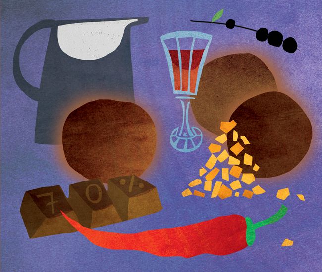 200 г горького шоколада (не менее 70%); 40 г сливочного масла; 200 мл жирных сливок (33%); 1 столовая ложка коньяка (вместо коньяка можно взять ром, виски, ликер «creme cassis» — словом, любой алкоголь с выраженным ароматом, а можно и вовсе обойтись без алкоголя); 1 яичный желток; какао для обсыпки. Варианты начинки: маленькие кусочки острого перца, нарезанная кубиками апельсиновая цедра, вяленая вишня (ее лучше с вечера замочить в роме или портвейне), черная смородина (ее нужно предварительно разморозить), орехи.
