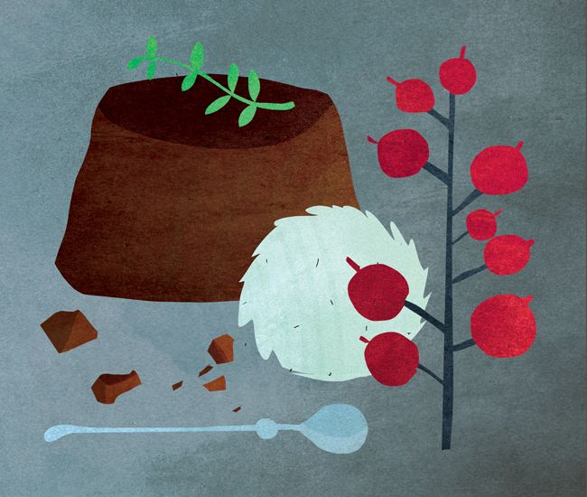 У шоколадного фондана нет никакой специфически рождественской репутации, но это, пожалуй, единственный его недостаток. Готовить его удивительно просто и удобно (тесто можно приготовить и разложить по формочкам заранее — скажем, накануне, так что к приходу гостей вам останется только поставить его в духовку буквально на несколько минут), смотрится он потрясающе эффектно, а единственный риск, связанный с его приготовлением, — это возможность передержать фондан в духовке. Однако даже если это случится, он все равно не будет испорчен безвозвратно — он просто превратится в банальное (хотя и очень вкусное) брауни.