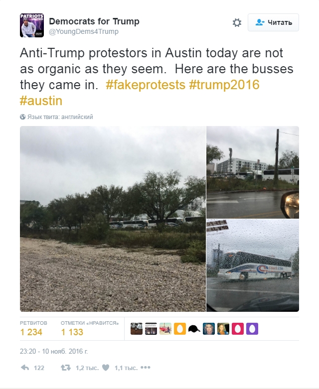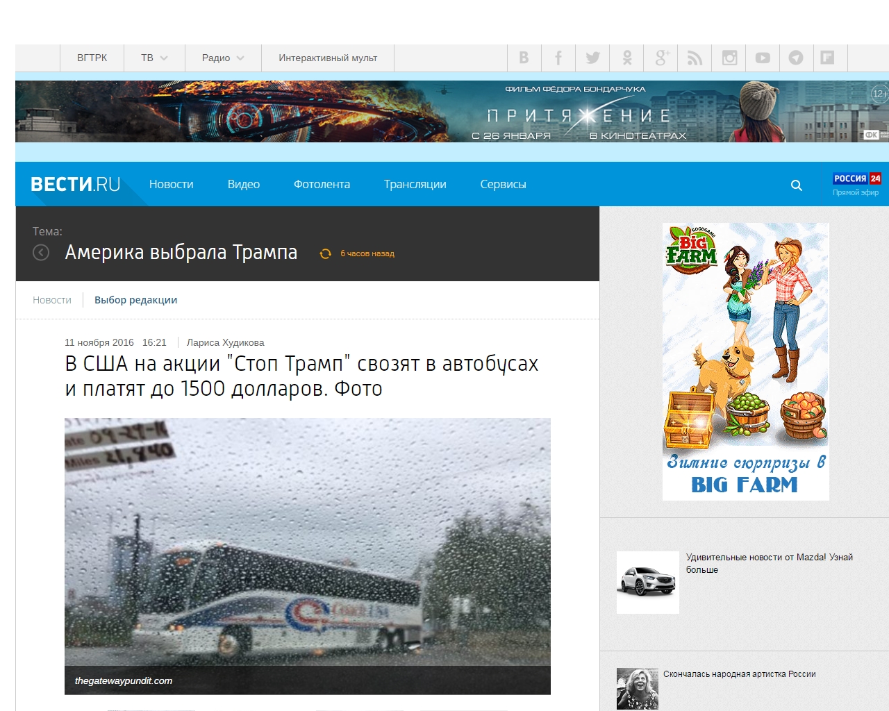 11 ноября российский интернет взбудоражила новость о том, что в США демонстрантов, выступающих против избранного президента Дональда Трампа, "свозят на автобусах" и платят им до 1500 долларов в неделю. Новость активно поддержало российское телевидение. "Вести" до сих пор держат эту информацию на своей странице.