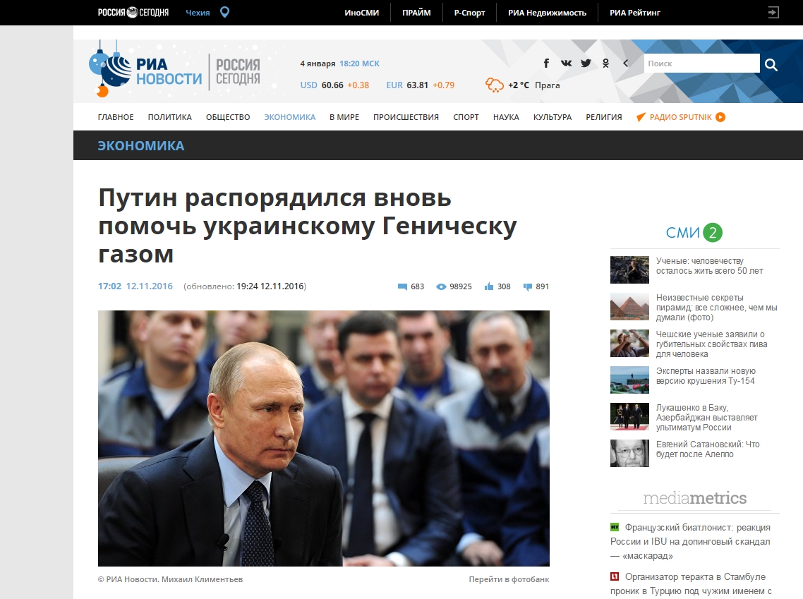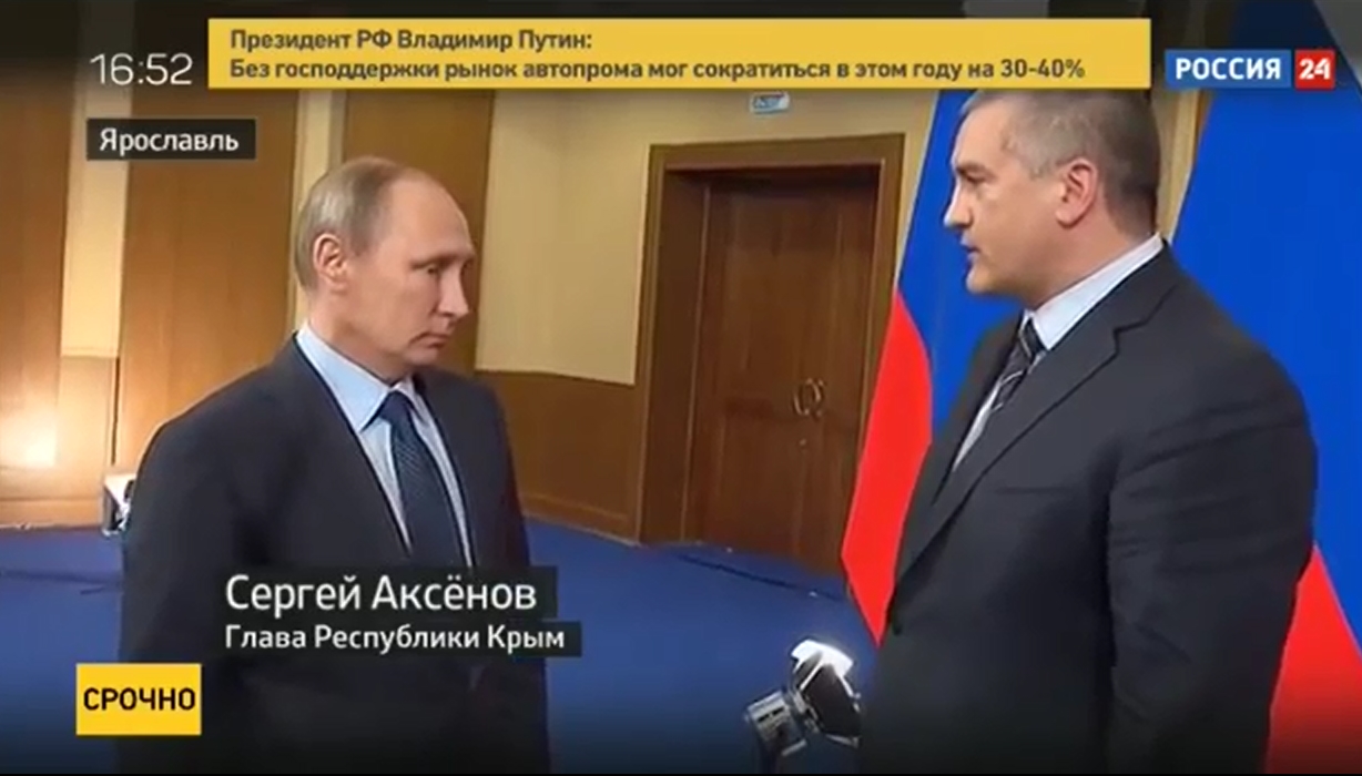 12 ноября российские средства информации распространили новость о том, что пророссийский глава Крыма Сергей Аксенов попросил российского президента помочь с газом "замерзающему" украинскому городу Геническу. Репортаж об этом показали на "России-24".