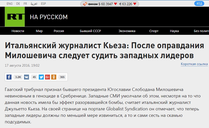 RT подхватила эту "новость" и развила настолько, что на сайте до сих пор присутствует призыв "посадить на скамью подсудимых" мировых лидеров за то, что мировое сообщество сотворило с Милошевичем.