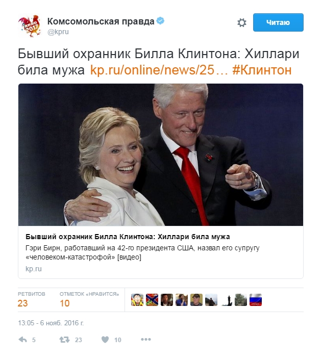 Информация "Комсомольской правды" основана на интервью, которое дал телеканалу "Звезда" бывший охранник Белого дома Гэри Бирн. В интервью он утверждал, что Билла Клинтона приходилось защищать от супруги, что однажды он даже видел синяк под глазом тогда еще президента Билла Клинтона. Все это Гэри Бирн изложил также в своей книге "Кризис характера", опубликованной летом прошлого года, в разгар президентской кампании в США.