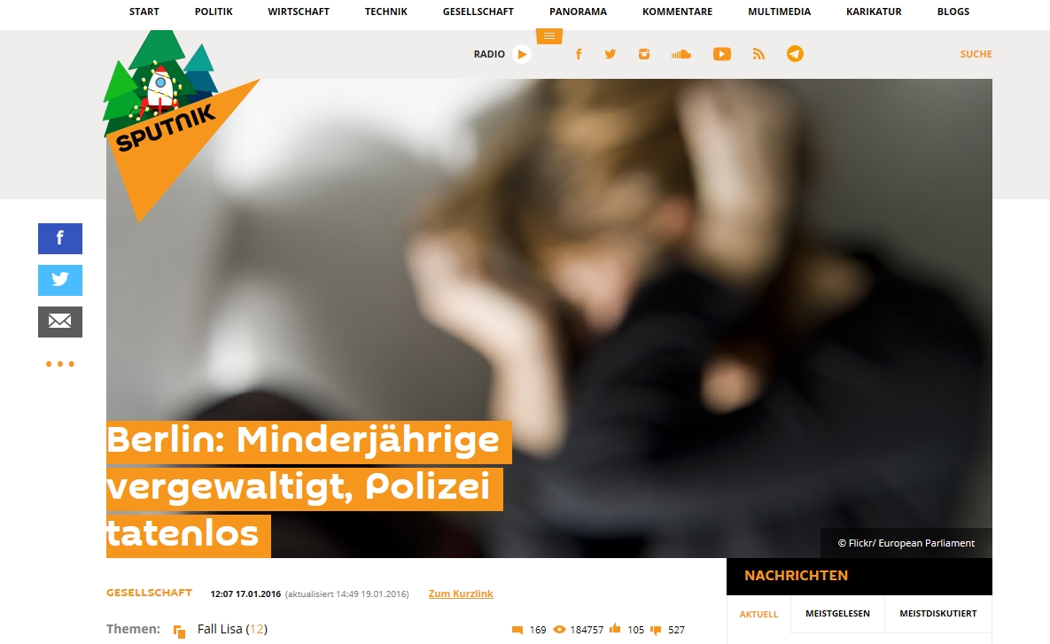 11 января прошлого года в Берлине 13-летняя девочка Лиза из семьи российских немцев не пришла домой. Не пришла она и в школу. Просто исчезла на день. А когда вернулась домой, рассказала родителям – так заявила мать, – что ее похитили и изнасиловали трое мужчин "арабской" внешности. Информация об этом стала бурно расходиться по социальным сетям – особенно в русскоязычном сообществе Берлина и в антииммигрантских группах. Может быть, она бы там и осталась, тем более что реальные обстоятельства отсутствия девочки выяснились довольно скоро, но в дело вмешался российский "Первый канал", корреспондент которого Иван Благой утверждал, что девочку изнасиловали "выходцы из арабских стран", и требовал от полиции не утаивать данные. Репортаж прошел в эфир 16 января.