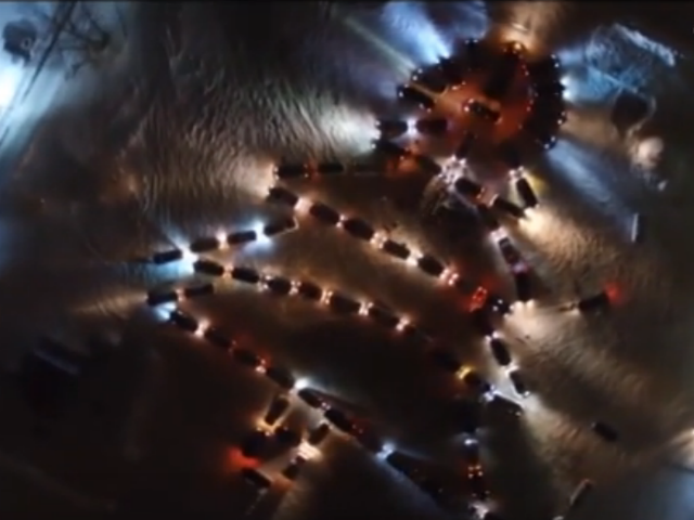 В честь праздника автомобилисты составили елку из своих автомобилей.