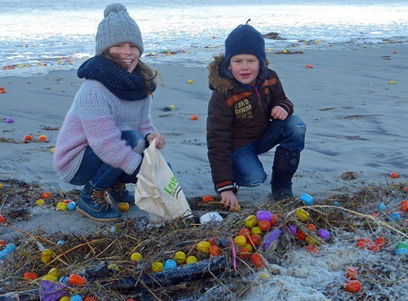 Предположительно, грузовое судно во время шторма потеряло контейнер с пластиковыми яйцами, которые затем выбросило на берег.