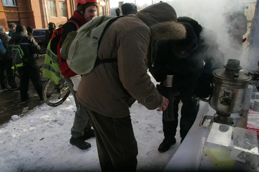 Рядом с самоварами кучкуются все — здесь можно немного отогреть руки. Из толпы периодически «заглядывают» снегурочки, зайчики, ангел, привидение. Саша, парень на низком самокате, приехал в костюме лягушки.