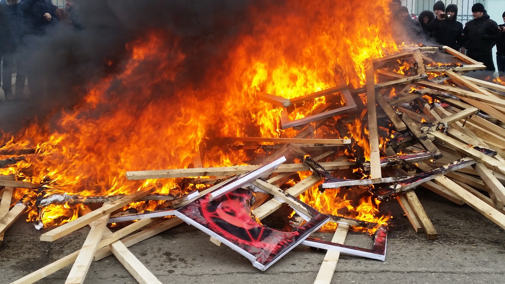 Плакаты с изображением боевиков, подготовленные для митинга министерством, были сожжены.