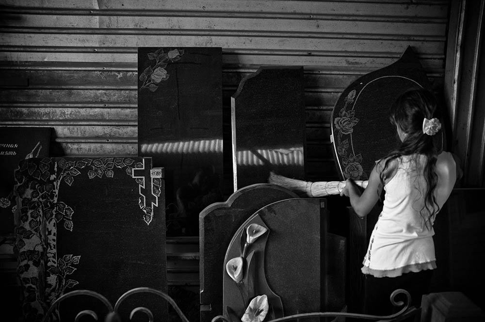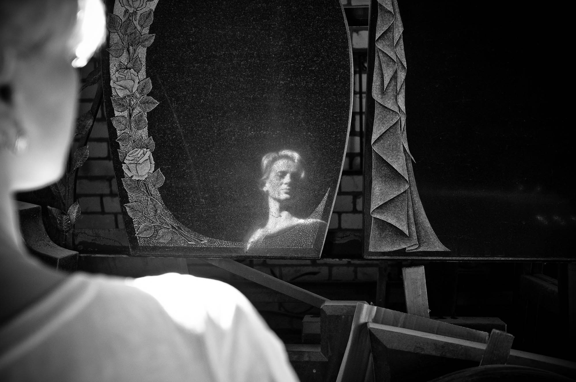 «Научить можно всему: сначала алмазом контуры выцарапываешь, потом пробиваешь, и камень внутри серым становится. Элементарно ведь! Да и работа у нас не мрачная. Ни венков тебе, ни гробов», — отрываясь от работы, вклинивается в беседу Алена. Напротив нас несколько скорбных портретов покойников, а рядом портреты тех, кто еще жив — одинокие пенсионеры боятся, что иначе останутся без могильного камня. Например, одна бабушка сначала купила надгробие мужу, потом сыну и сестре, а в конце концов и себе выбрала. Стоит уже третий год на складе — хранение бесплатно.
