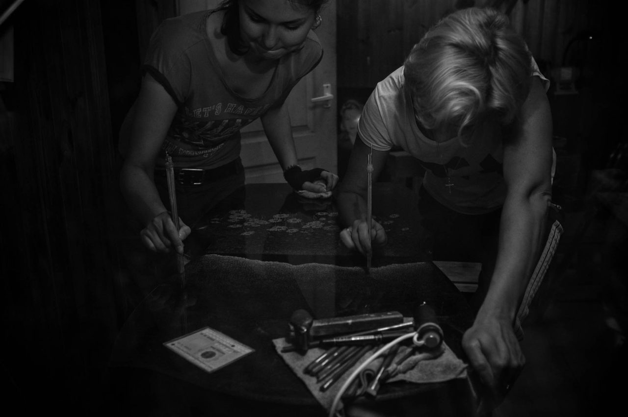 Наталья со своей помощницей в мастерскойФото: Антон Карлинер У всех работниц художественное образование. Отучившись на конструктора одежды, каждая поняла, что работа в ателье ценится меньше, чем труд гравера. 33-летняя Наталья Мельникова работает дольше всех— уже 13 лет набивает портреты умерших. «Мужики в нашей сфере часто запивают, наступает какой-то творческий кризис, и понеслась душа в рай. Девушки более усидчивы и вообще аккуратнее к работе относятся», — говорит Мельникова.