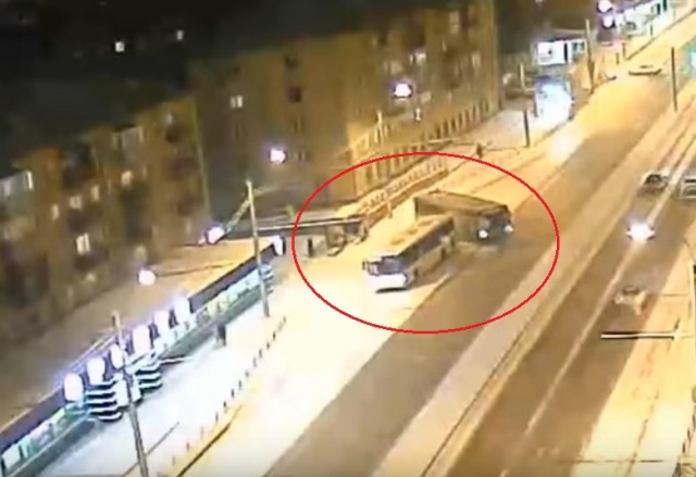 На ролике видно, как водитель зеленого автобуса (маршрут №52), не успев затормозить перед остановкой «Красномосковская», въехал в белый автобус (маршрут №5).