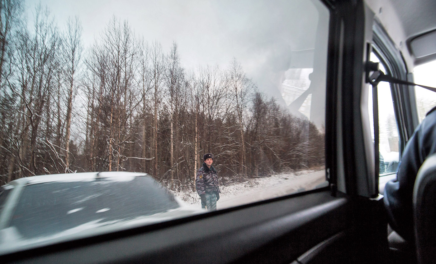 Сотрудник полиции, снятый из окна полицейской машины возле ИК-7 в Сегеже. Фото: Давид Френкель / Коммерсант