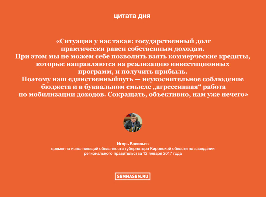 На заседании правительства 12 января временно исполняющий обязанности губернатора Кировской области Игорь Васильев, оценивая напряженную ситуацию с бюджетом, сказал, что власти надеются за три-четыре года удвоить доходы региона. При это сокращать расходы уже практически невозможно.