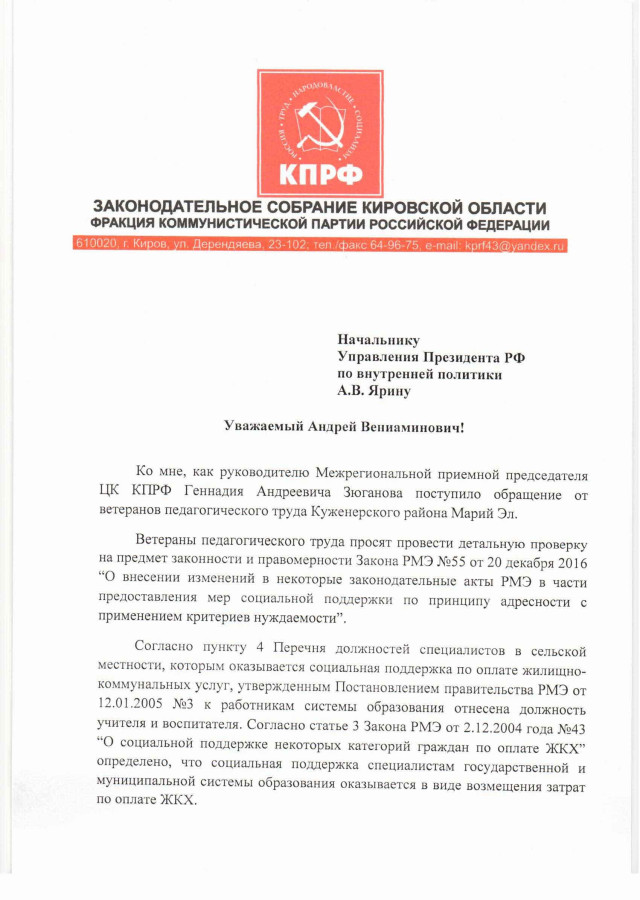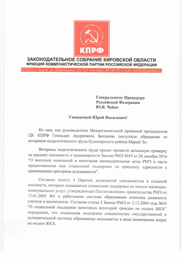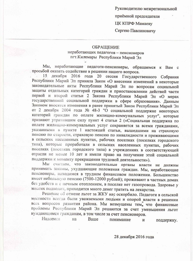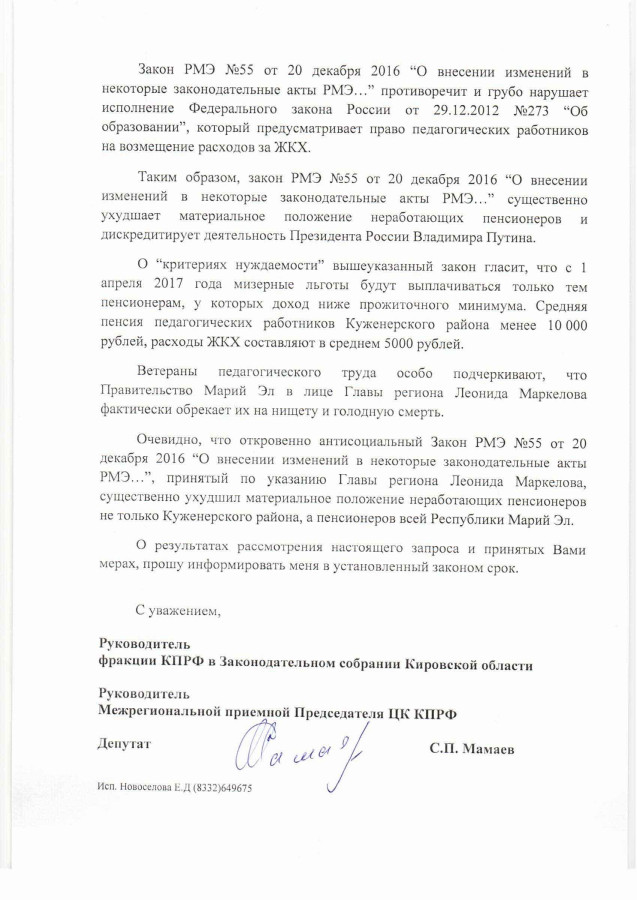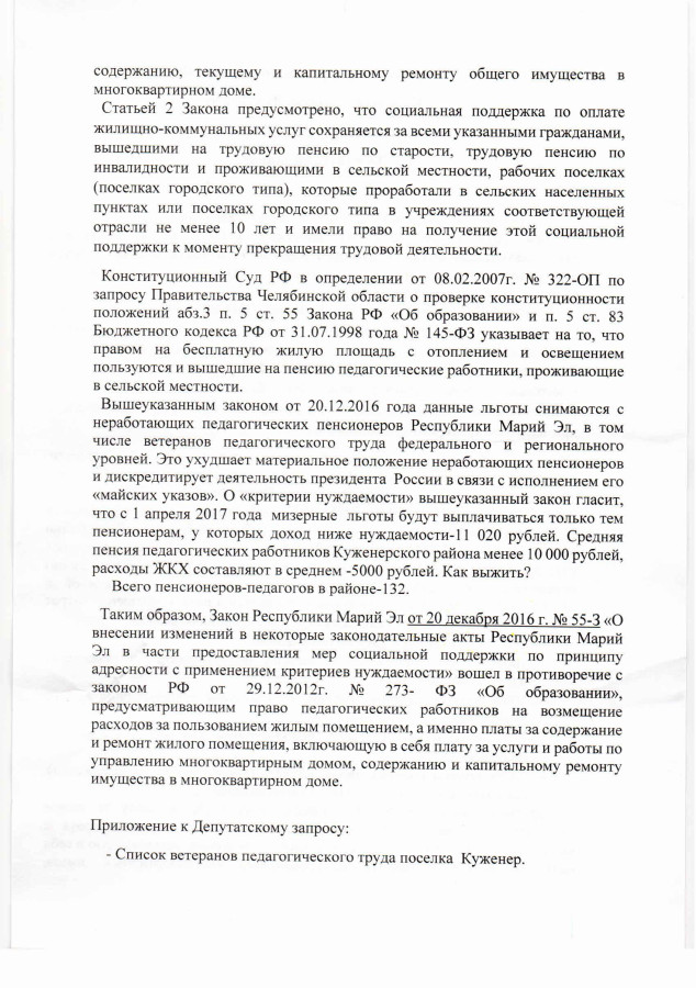 Очевидно, что откровенно антисоциальный Закон Республики Марий Эл №55 от 20 декабря 2016 “О внесении изменений в некоторые законодательные акты РМЭ…”, принятый по указанию Главы региона Леонида Маркелова, существенно ухудшил материальное положение неработающих пенсионеров не только Куженерского района, а пенсионеров всей Республики Марий Эл.