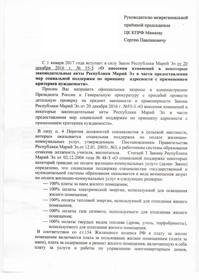 Таким образом, закон РМЭ №55 от 20 декабря 2016 “О внесении изменений в некоторые законодательные акты РМЭ…” существенно ухудшает материальное положение неработающих пенсионеров и дискредитирует деятельность Президента России Владимира Путина.