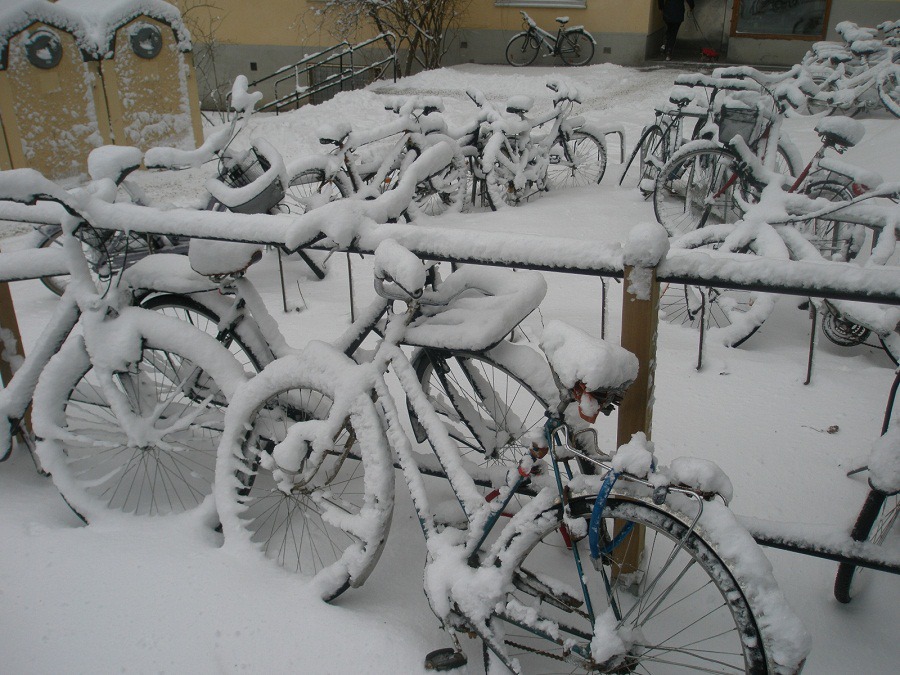 И всё же велосипедисты в снегопад в Стокгольме нам попадались нечасто. С шипами или без шипов — неважно. Большая часть велосипедов действительно казалась впавшей в зимнюю спячку.