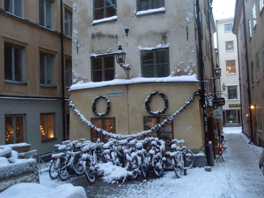 Так велосипеды превратились в уличные украшения. На шведских улицах украшений немного. Всё скромно и сдержанно. Ёлки без игрушек, фонари со свечами, гирлянды... И присоседившиеся к ним велосипеды. Иногда какой-нибудь швед, покопавшись в заснеженных велосипедах, обнаружит свой, оседлает его и нарушит гармонию. Но большинство велосипедов, тесно прижавшись друг к другу, пережидают холод и снегопад.