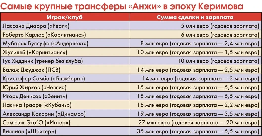 А ведь еще 3,5 года назад большинство звезд «Анжи» обогащалось на такую сумму (только в евро) за пару-тройку дней, банковский счет тренера Гуса Хиддинка увеличивался на единичку с шестью нулями меньше чем за 24 часа, ну а Самюэль Это’O зарабатывал пресловутый миллион фактически за ночь. Страна возмущалась подобным транжирством, футбольная Европа ждала наступления «Анжи» по всем фронтам, но пир во время чумы завершился так же стремительно, как и начался. В августе 2013-го Керимов, мечтавший о золотых медалях и лиге чемпионов, но так и не откупоривший шампанского, сослался на проблемы в бизнесе и разом свернул шапито-шоу, подписав вольную порвавшим его карман и здоровье легионерам во главе с крутым камерунцем и аборигенам под предводительством Игоря Денисова.