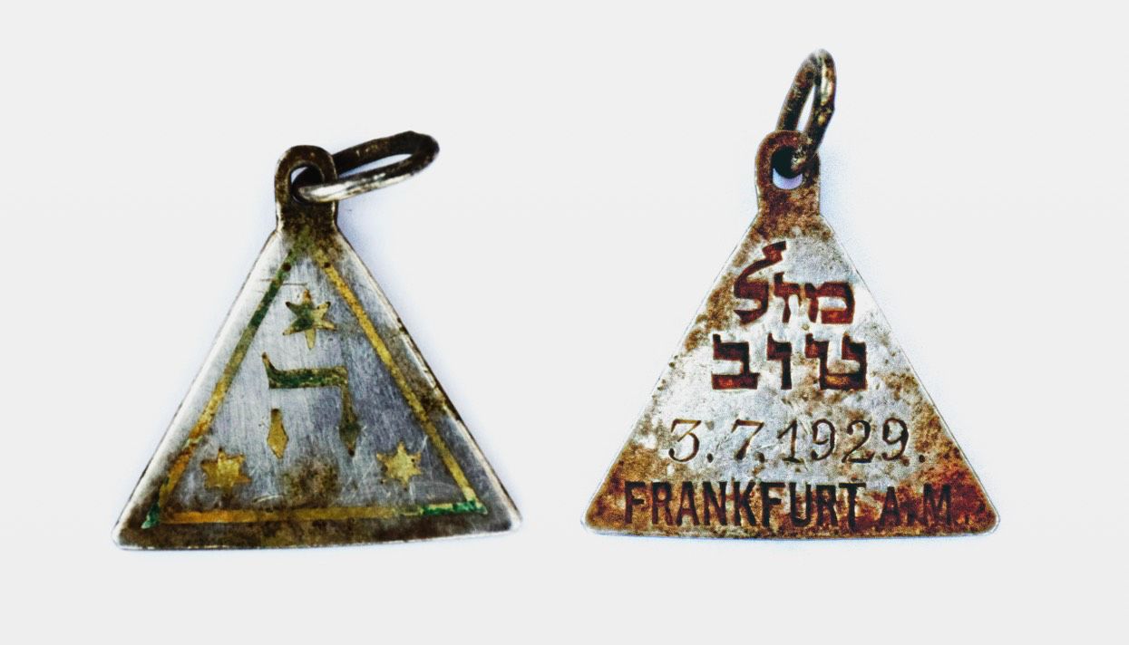 С одной стороны кулона выгравированы выражение «Мазаль тов», дата рождения и надпись «Франкфурт-на-Майне». На другой стороне подвески — три звезды Давида и буква ה («хе»), которой иудеи обозначают бога.