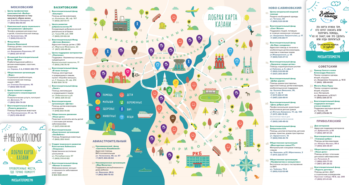 Акция «Добрая карта Казани #мнебыктопомог» стартует 17 января, она будет информировать нуждающихся обо всех благотворительных организациях города, профессиональному опыту которых можно доверять. Основная идея проекта — распространить карту среди тех, кто нуждается в помощи, но не знает, где ее можно получить. По мнению организаторов, акция позволит переосмыслить роль благотворительности в современном обществе.
