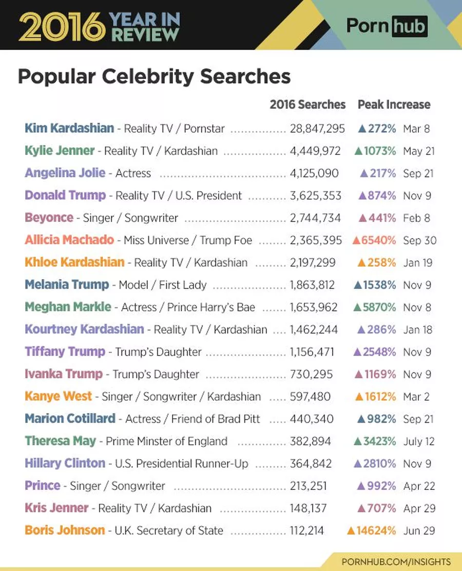 Наблюдался также рост поисковых запросов, связанных с играми и вымышленными персонажами, при этом рост соотносится с датами релизов игр и премьерами кино: чувствительно отреагировали пользователи на релизы игр Overwatch, Pokemon Go, а также на премьеры новых «Охотников за привидениями», где, как известно, команда стала полностью женской. Еще один аргумент в пользу включенности зрителя в общий событийный поток — реакция на медийную активность таких знаменитостей как семейства Трампов, сестер Кардашьян, Терезы Мэй и Бориса Джонсона и поиск их следов в записях на PornHub.