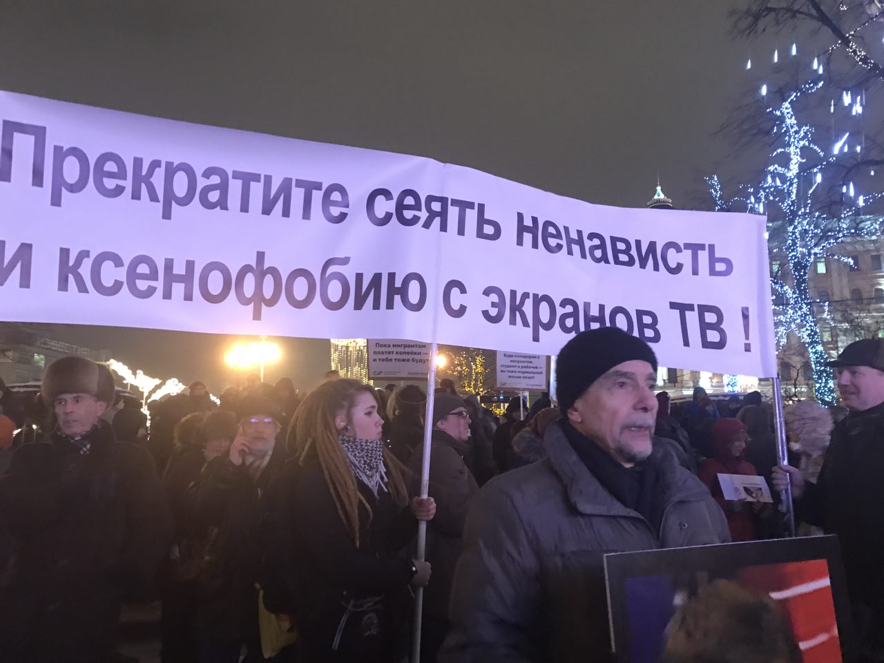 Часть людей пришли с антифашистскими плакатами: «Будь солидарен с мигрантом, студент и рабочий — он тоже нормальной жизни хочет!», «Пока мигрантам платят копейки — и тебе тоже будут!», «Единство в борьбе, а не в бесправии».
