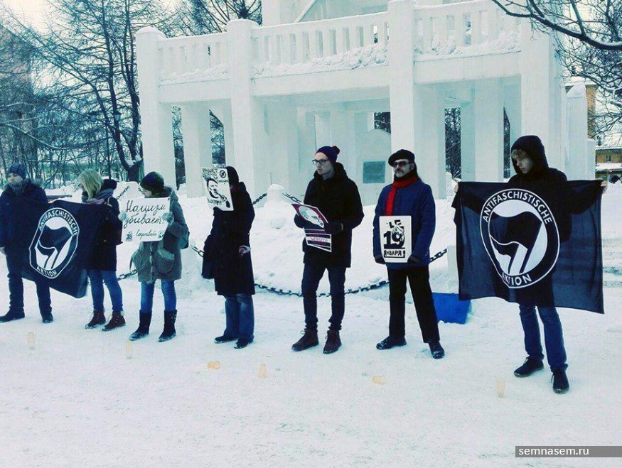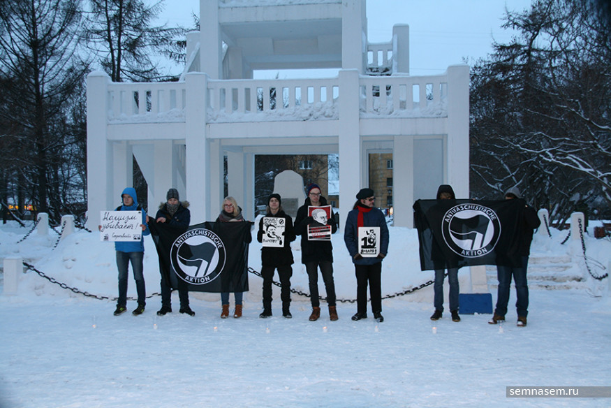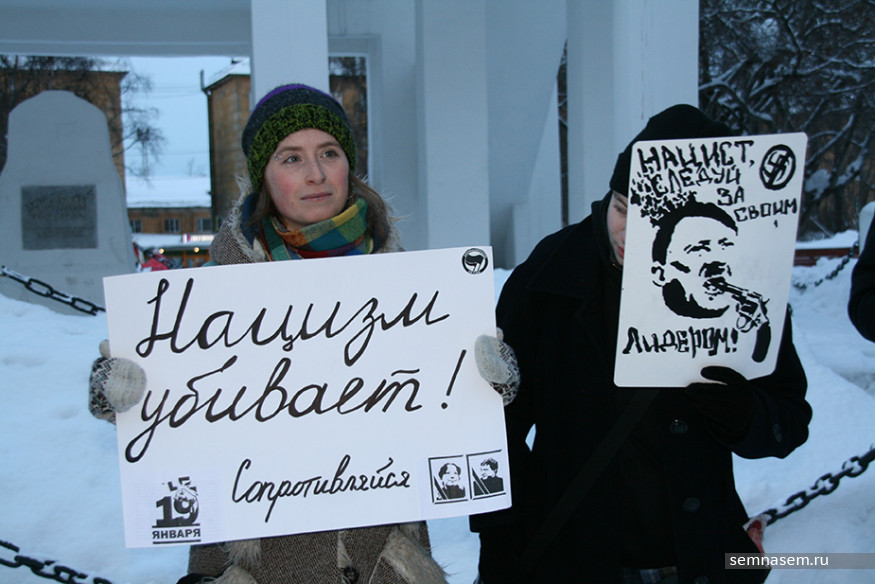 Пикет начался в 14:00. Активисты молча стояли с плакатами, на которых были надписи «19 января», «Нацизм убивает!». Через полчаса к участникам акции, по их словам, подошли сотрудники «в штатском». После этого всех пикетирующих посадили в две машины и увезли в отделение. По данным нашего корреспондента, среди задержанных есть постоянные участники акции памяти, которая проходит 19 января. Такое массовое задержание состоялось впервые.