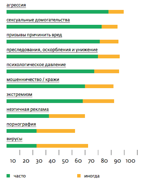 Первыми в списке - агрессия, сексуальные домогательства, призывы причинить вред, оскорбления. Приэтом надо понимать, говорю, что вы, взрослые, знаете, как остановить агрессию, пресечь сексуальные домогательства или оскорбления. А они - не знают. Но есть и другая сторона этой таблицы. Среда, в которой это происходит, собственно, и составлена из них - подростков. А подросткам, как известно, присущи и агрессия, и оскорбления, и секс, знаете ли.... Их только по этому стоит контролировать, что они делают.)) А с контролем родительским у нас вот такая картина.... (не обращайте внимание на проценты без объяснений, но визуально картинка ясна).