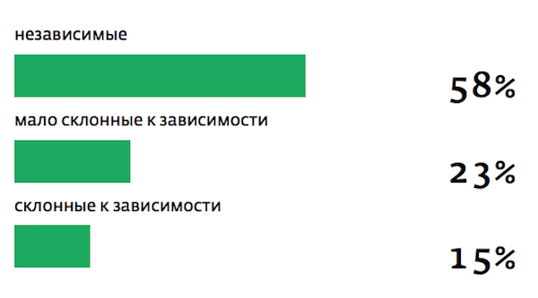 Замечу, из 15% "склонных" далеко не у всех есть свой комп или смартфон. И интернет. Исследования-то наши, российские. Так что в реальности процент интернет-зависимых много меньше. Сколько точно - ответов не нашёл.
