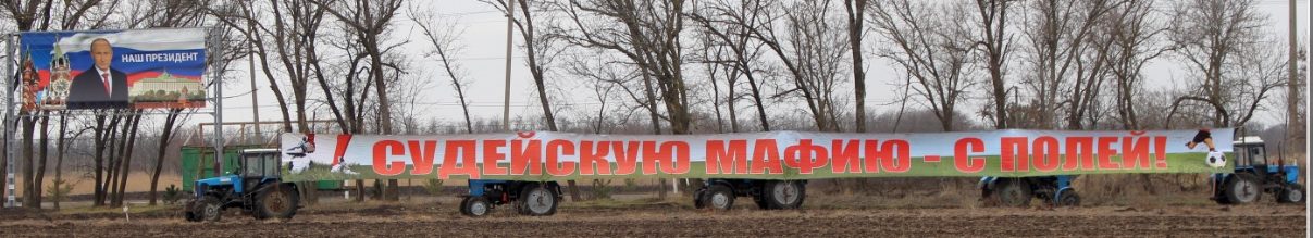 Таким «мероприятием» полиция сочла баннер «Судейскую мафию с полей!», который был размещен на сельскохозяйственных угодьях ООО «Сфера». Баннер имел спортивную тематику, о чем ясно свидетельствовали нарисованное на нем футбольное поле и фигуры футболистов с мячом. При этом, размещение данного баннера не сопровождалось никакими публичными мероприятиями. Нина Попова в его размещении участия не принимала.