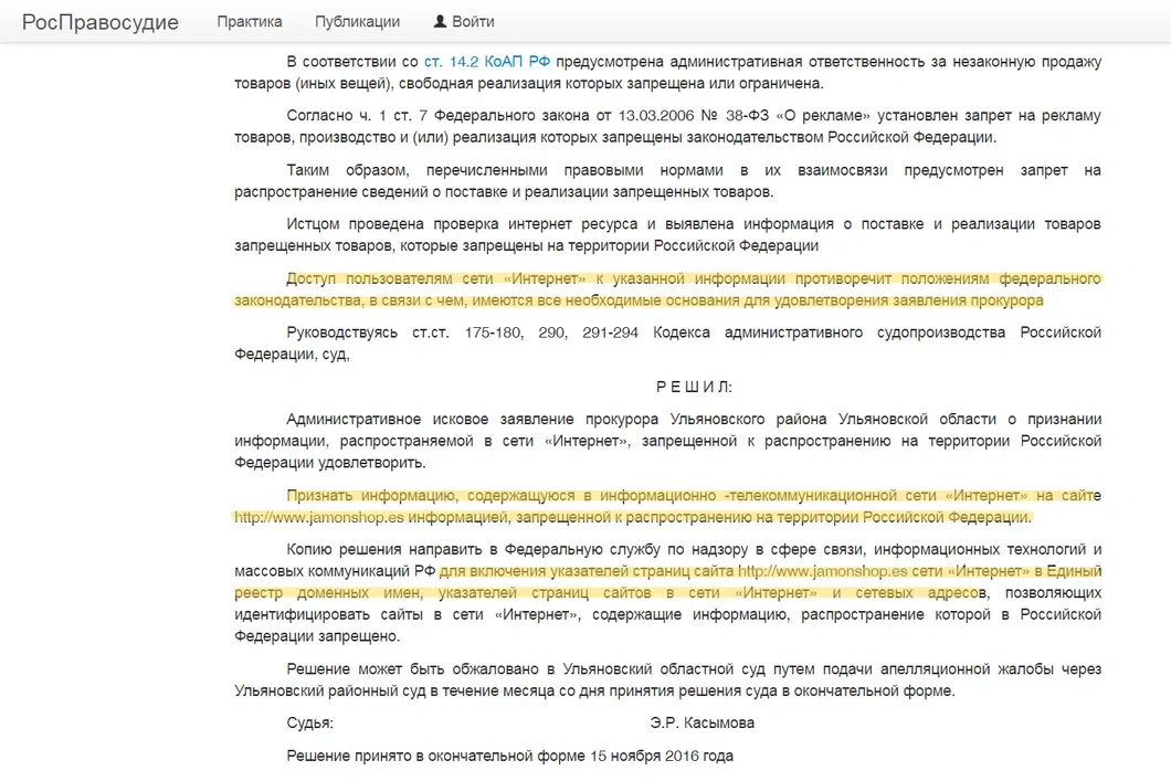 Ульяновский районный суд внес сайт испанского интернет-магазина по продаже мясных изделий jamonshop.es в список запрещённых ресурсов. Это следует из решения суда, опубликованного порталом «Росправосудие». Вот выдержки из него: