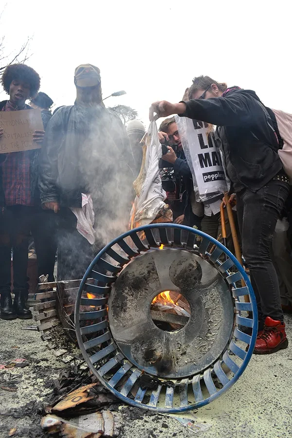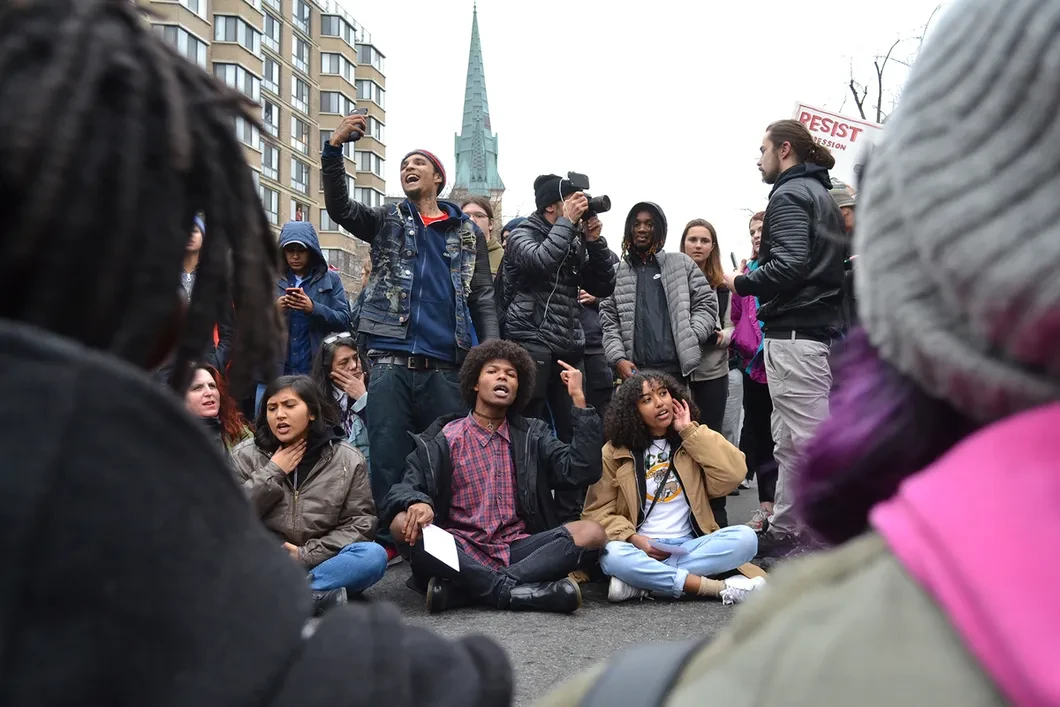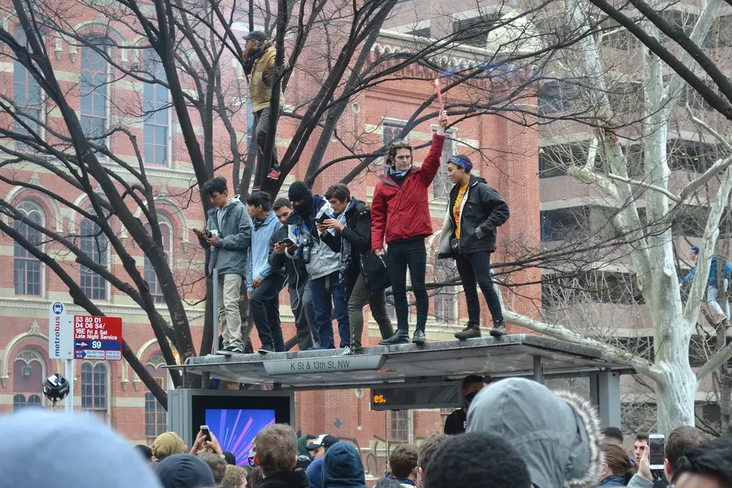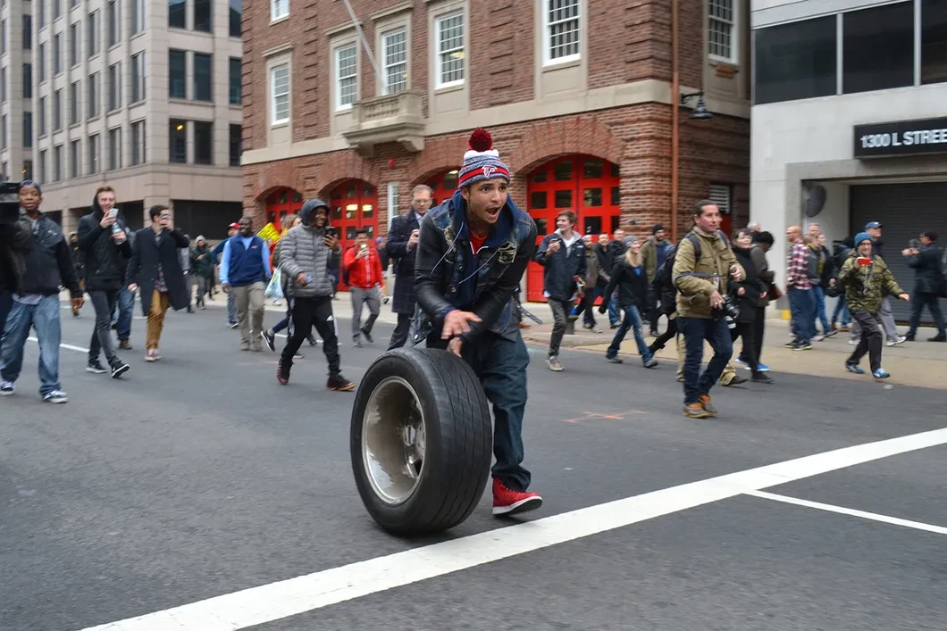 Ближе к вечеру на улицах стала явно преобладать молодежь. Ей явно хотелось какой-то движухи. Протестующих можно было разделить на две группы: те, кто приехал с плакатами (они постояли с ними, затем остались поглазеть на город или поехали домой), и те, кто, возможно, с самого начала готовился к каким-то уличным акциям. Последние бросались в глаза: они были одеты в черное, в масках и шарфах. Мы легко можем представить себе, как обычно выглядят такие люди. Я насчитал их под сотню человек. Они переворачивали мусорные баки, коробки с газетами, что установлены на остановках в Вашингтоне, и поджигали их. У них были фаеры. Когда эти люди начали быть витрины магазинов, вмешалась полиция.