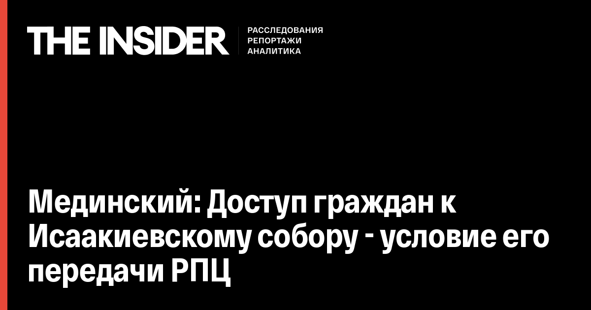 «Ключевым, на мой взгляд, условием, о чем я с представителями Церкви говорил, является то, что после соответствующей полной передачи доступ граждан в Исаакиевский собор, причем включая и смотровые площадки, и иные помещения собора, должен не только не уменьшиться - он должен увеличиться и облегчиться», - сказал Мединский.