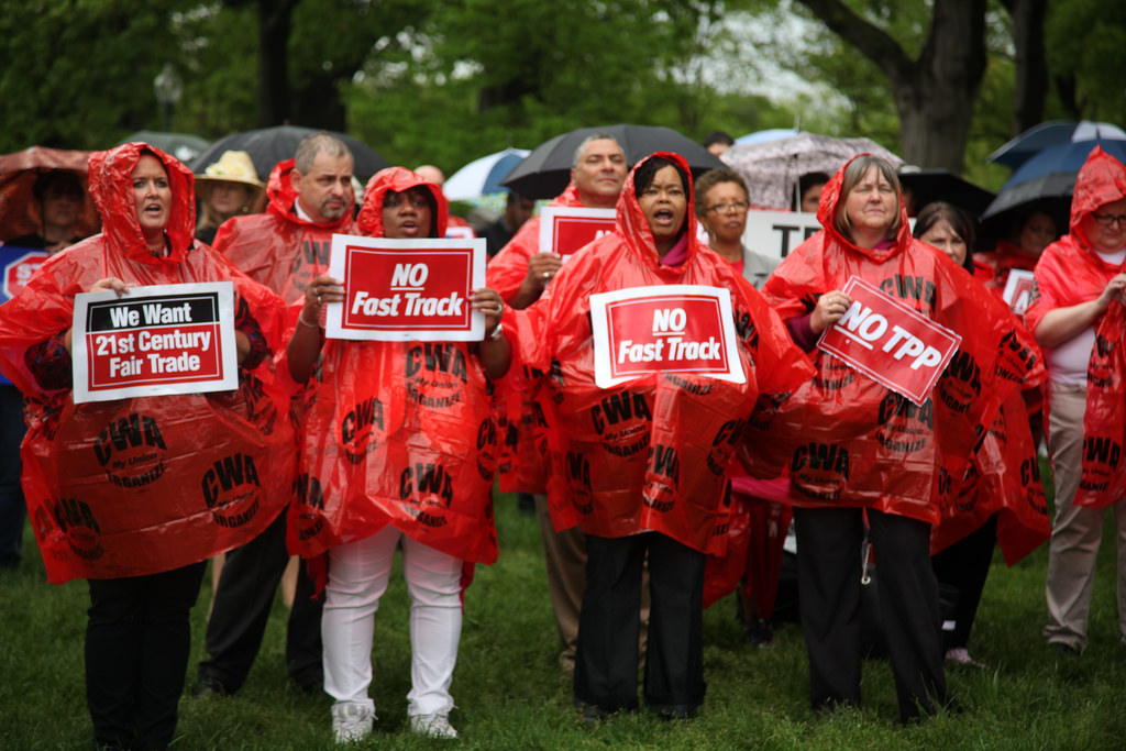 Митинг американских профсоюзов против участия США в ТТП. 2014 AFGE Критика, оговаривает Bloomberg, в первую очередь, направлена на то, что выход США из большого международного торгового проекта ослабляет их позиции по отношению к таким крупным конкурентам, как ЕС и Китай. Белый дом возражает на это, что отказ от пакетных сделок не отменяет возможности и необходимости договариваться с другими странами в двустороннем порядке, причем с преимуществом в виде большей гибкости.