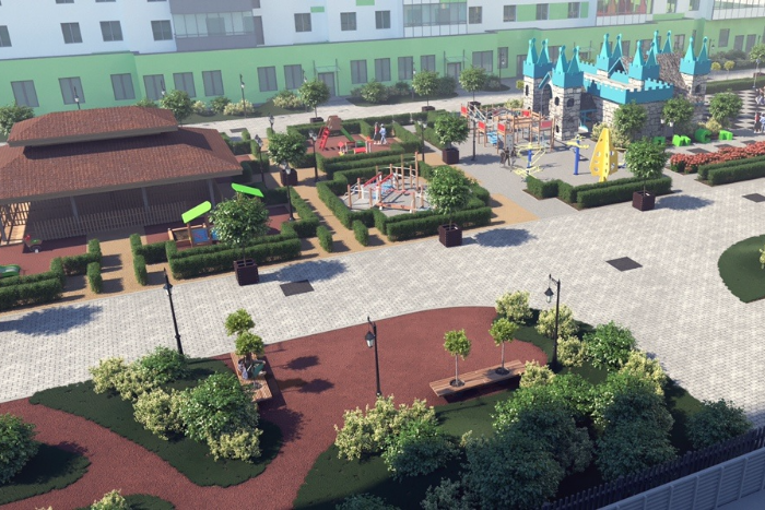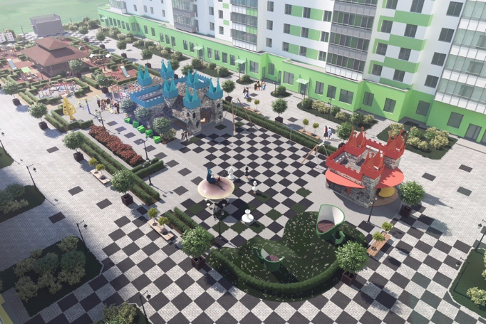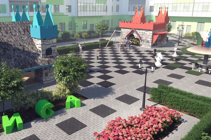 Согласно концепции застройщика, во дворе второй очереди ЖК построят «замки королевы», где летом можно будет организовывать концерты и игры, открытую площадку «шахматная доска», беседки в виде чашек-лавочек и гигантского гриба с гусеницей. Дворовую территорию поделят на две зоны. На первой расположатся площадки мини-детсада на 50 мест, а на второй — беседки с wi-fi зонами и площадки для занятий спортом.