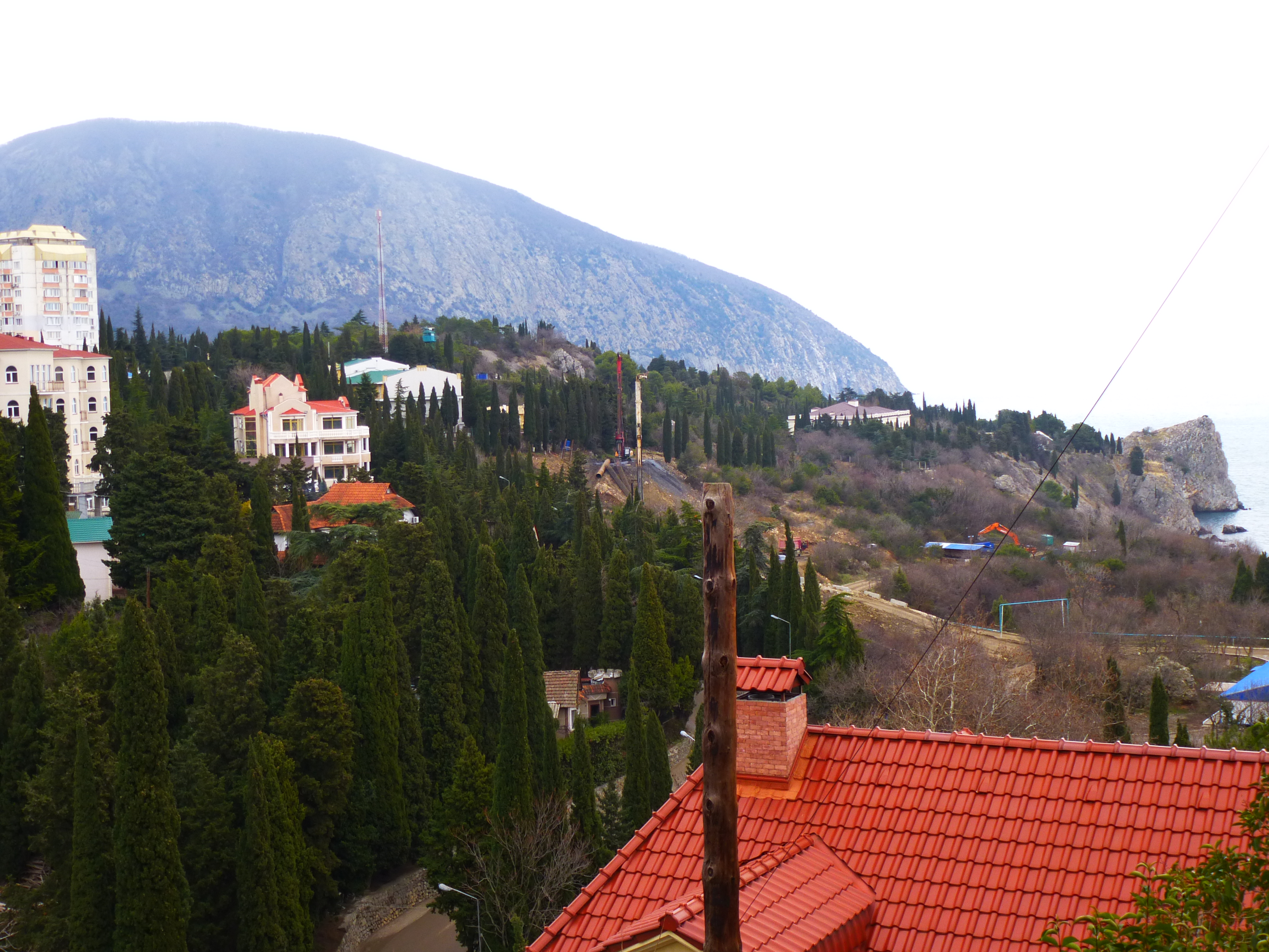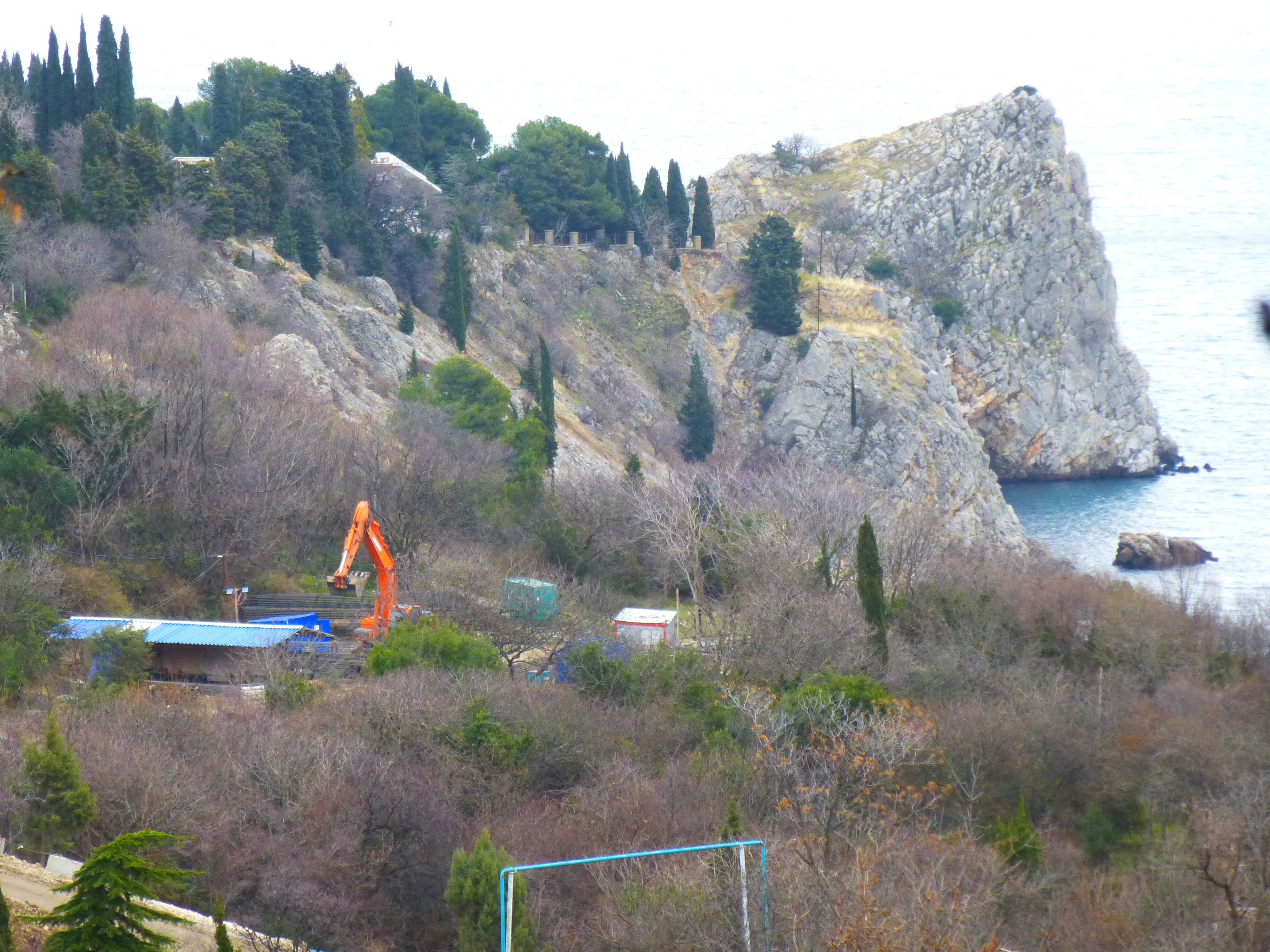 Чтобы полюбоваться Аю-Дагом, или Медведь-горой, нужно забраться повыше: артековский забор теперь закрывает и эту достопримечательность. С улицы Геологов, которая взбирается на крутой холм, можно рассмотреть не только лесистые склоны несостоявшегося вулкана, но и бывшую поселковую территорию, которая теперь принадлежит "Артеку". Там работают кран, экскаватор и другая тяжелая техника. Строители готовят территорию для возведения нового артековского лагеря "Солнечный".