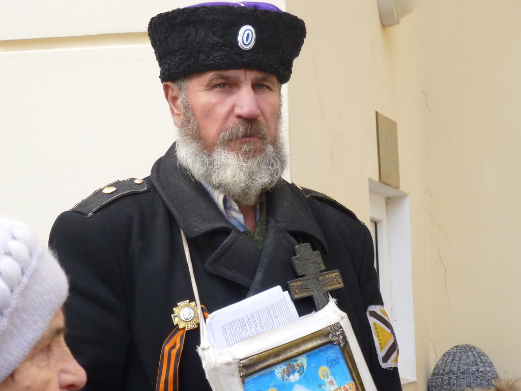 Человек с седой бородой и казачьими атрибутами периодически осенял толпу большим наперсным крестом. Мальчик лет десяти размахивал российским флагом, привязанным к спиннингу.