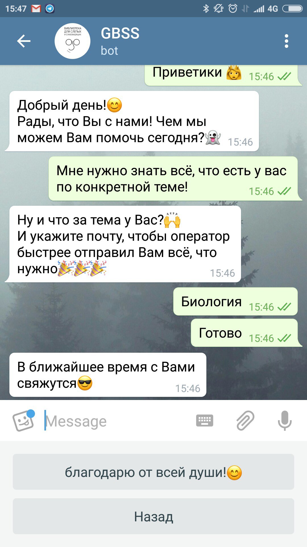 Петербургская библиотека для слепых и слабовидящих создала бота в Telegram для заказа книг из фонда библиотеки. С помощью него можно запросить список литературы для курсовой или диплома по любой теме и любую книгу из фонда библиотеки.