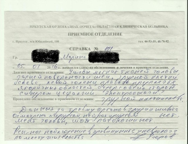 Той же ночью сотрудники травмпункта сообщили в отдел полиции о совершенном там преступлении, после чего к Рузаевым домой приехал участковый. Марина подала заявление в полицию, а утром Павел отвез ее заявление и в следственный комитет. Затем Рузаева обратилась к иркутским медикам, которые в зафиксировали у женщины ушибы мягких тканей головы, шеи, грудной клетки, голени и предплечья, бедер, а также несколько электроожогов на теле..