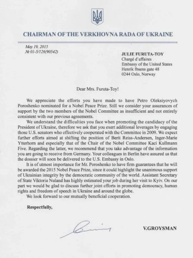 В письме, впоследствии названном и украинской, и американской сторонами фальшивкой, от имени Верховной рады дипломатов США в Осло просят оказать давление на Нобелевский комитет с тем, чтобы премия Мира была гарантировано присуждена Петру Порошенко. По версии автора фейкового письма, пока на стороне Порошенко два члена комитета, а этого явно недостаточно.