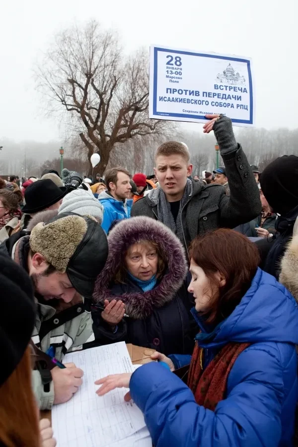 Со сцены к горожанам обращались Борис Вишневский («Яблоко»), Максим Резник и Оксана Дмитриева (Партия роста), Алексей Ковалев («Справедливая Россия»), Андрей Пивоваров из «Парнаса». Услышать политиков было трудно уже в третьем ряду от импровизированной сцены: запрещенные микрофоны оказались бы очень кстати. Но петербуржцам хватало общения между собой. Обсуждали Исаакий. Люди пересказывали друг другу историю собора, доказывая, что он никогда не принадлежал церкви, возмущались высказываниями некоторых федеральных политиков, в частности, Петра Толстого с его «чертой оседлости».