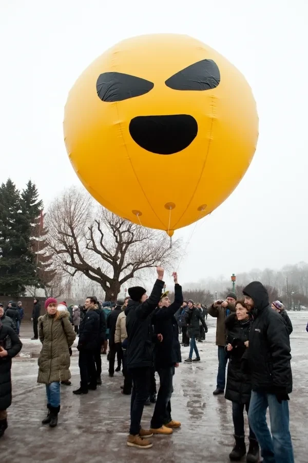 Участники встречи, несмотря на запрет, держали плакаты «Не укради», «Христа на РПЦ нет», «Богу не нужна недвижимость» и другими. Организаторы раздавали желающим синие ленточки — символ градозащитного движения. Кто-то принес гигантский желтый воздушный шар, на котором изобразили прорези для глаз и рта, напоминающие балаклаву Pussy Riot, ставших известными после скандала с танцем в Храме Христа Спасителя. Похожие шарики поменьше получали и участники встречи.