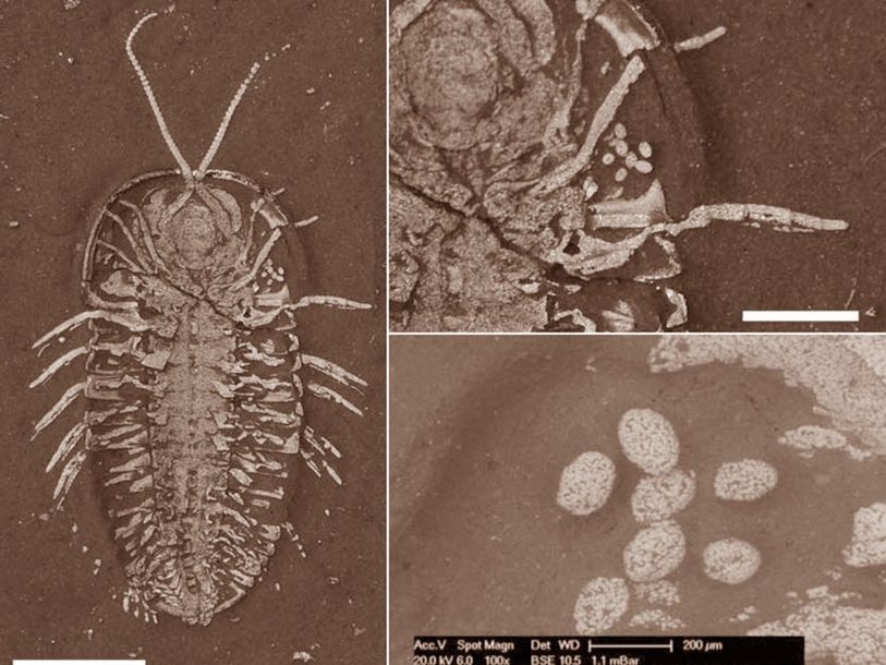 Трилобит Triarthrus eatoni и его яйца Thomas A. Hegna et al., doi: 10.1130/G38773.1 Ученые из Университета Западного Иллинойса описали окаменевших трилобитов, на теле которых имелись яйца. Хотя это не первый случай обнаружения яиц трилобитов, впервые удалось установить связь яиц с конкретным видом этих животных и найти яйца там, где они располагались при жизни животного. Находка позволила выдвинуть новые предположения о том, как размножались трилобиты.