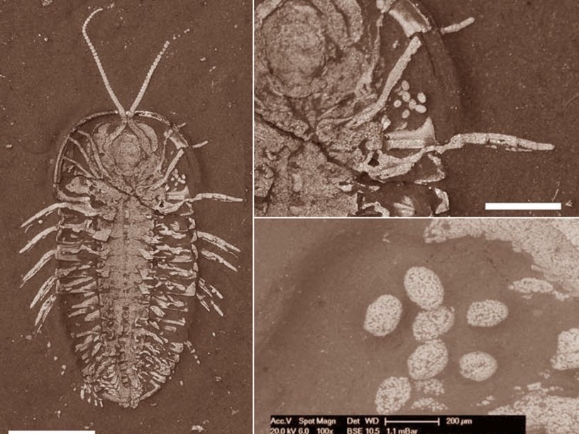 Окаменевший трилобит и его яйца. Справа внизу – изображение яиц под растровым электронным микроскопом. Thomas A. Hegna et al., doi: 10.1130/G38773.1