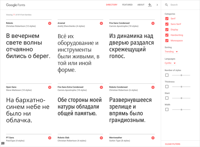 Самое очевидное место, где стоит искать бесплатные шрифты, — это, конечно же, Google Fonts, где на данный момент доступно 76 кириллических шрифтовых семей (каждая семья включает в себя несколько начертаний). Неочевидное место для поиска бесплатных шрифтов — акции и распродажи в крупнейшем интернет-магазине MyFonts, где с помощью расширенного поиска можно найти более сотни бесплатных кириллических начертаний.