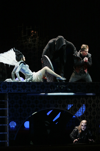Вот все и объяснилось. Принц Калаф, оказывается, всю дорогу представлял себе стройную модель в белом платье, ради которой он готов был потерять голову в прямом и переносном смысле. Она постоянно мельтешит у него перед глазами, дергается и заламывается своим тонким станом, но только открывает рот, а не слышно, что поет. Поет другая, устрашающего вида, с могучим, как и положено в этой партии, голосом и просвечивающей из-под юбки коллекцией черепов предыдущих претендентов-женихов. Вторая, настоящая, Турандот мечется на нижнем этаже декораций, а на глаза Калафу показывается только в последнюю минуту. И тогда он в ужасе понимает, что натворил: хорошую, любящую девушку Лиу проглядел и обрек на самоубийство, а сам благодаря своим болезненным мужским фантазиям получил вот это вот гневливое чудище.
