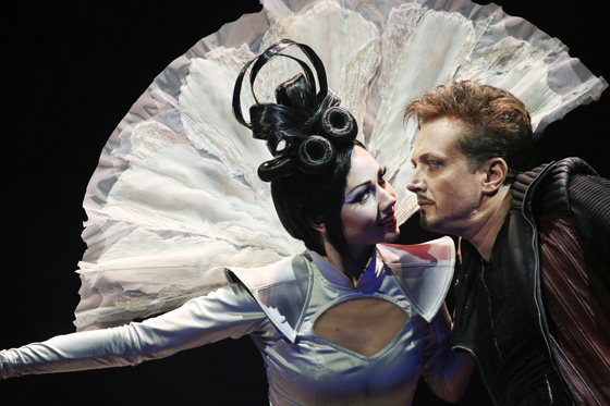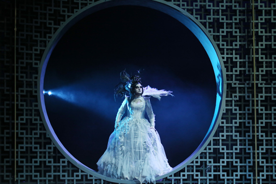 © Анна Молянова / Геликон-опера Канадская дизайнерша китайского происхождения Камелия Куу смешала дозированное количество экзотики из Поднебесной с новыми технологиями и огромной зловещей луной из триеровской «Меланхолии». Луна иногда превращается в крутящееся лезвие, светящиеся шары в руках, как всегда, активно танцующего геликоновского хора (хореограф — Эдвальд Смирнов) оттеняют общий темный колорит (мастер по свету — еще один импортный гость Томас Хазе), свои убийственные загадки Турандот выкрикивает сквозь три водопроводных люка. Идея понятна, но вообще с круглыми предметами на сцене некоторый перебор.